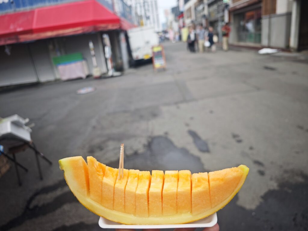 夏の北海道はいたるところでカットメロンを売っています。北海道に6年住んでいた男からのアドバイスなんですけど、北海道のメロンは美味しいので見つけ次第どんどん食べていったほうがいいですよ。
