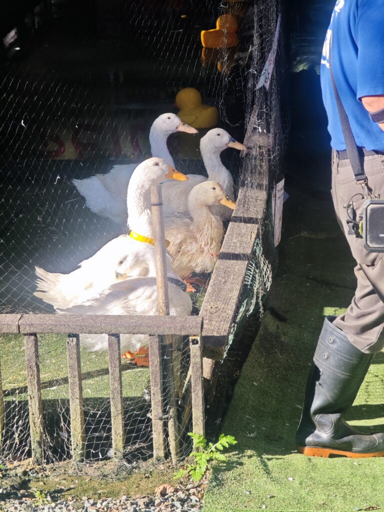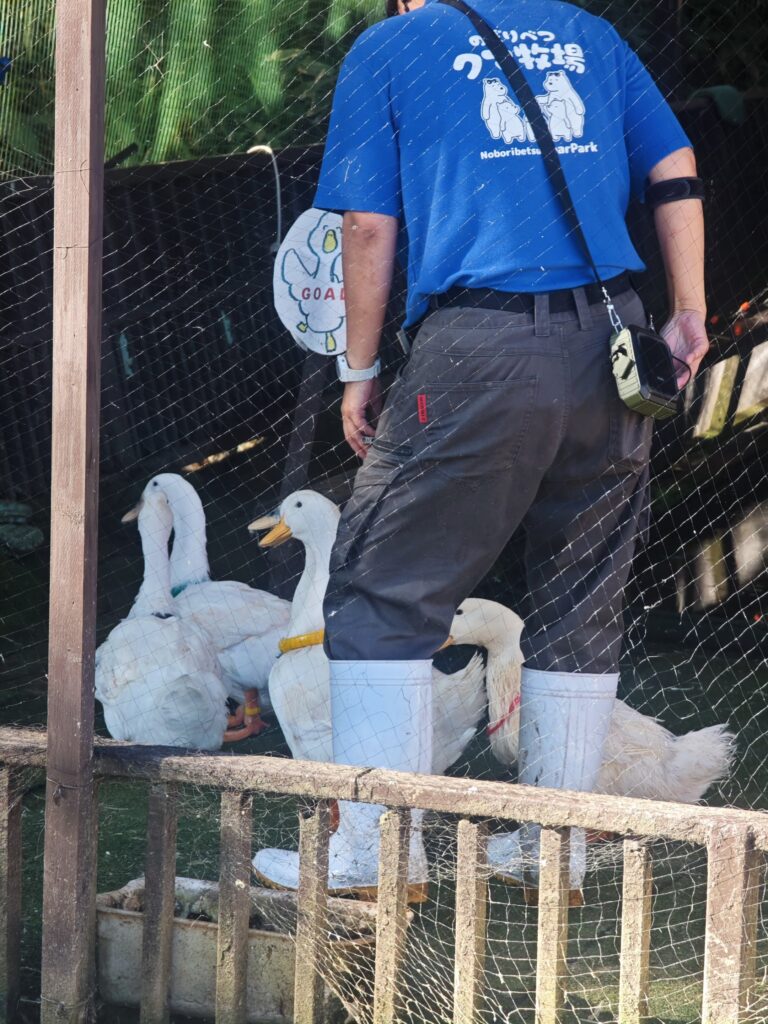だいぶ飼いならされて野生を失っているヒグマに餌をやっていると、近くで突如アヒルレースが開幕しました。