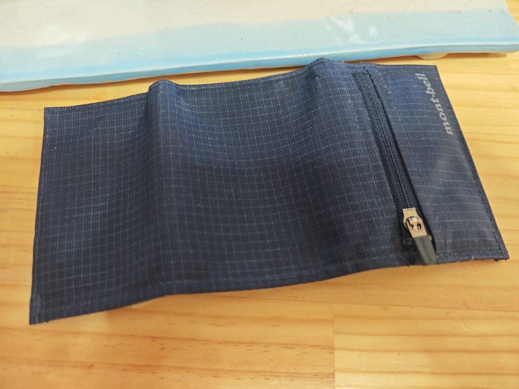 トレールワレットってやつですね。ネットのステマに流されて買ってしまいました。モンベルの超ちっこい財布です。