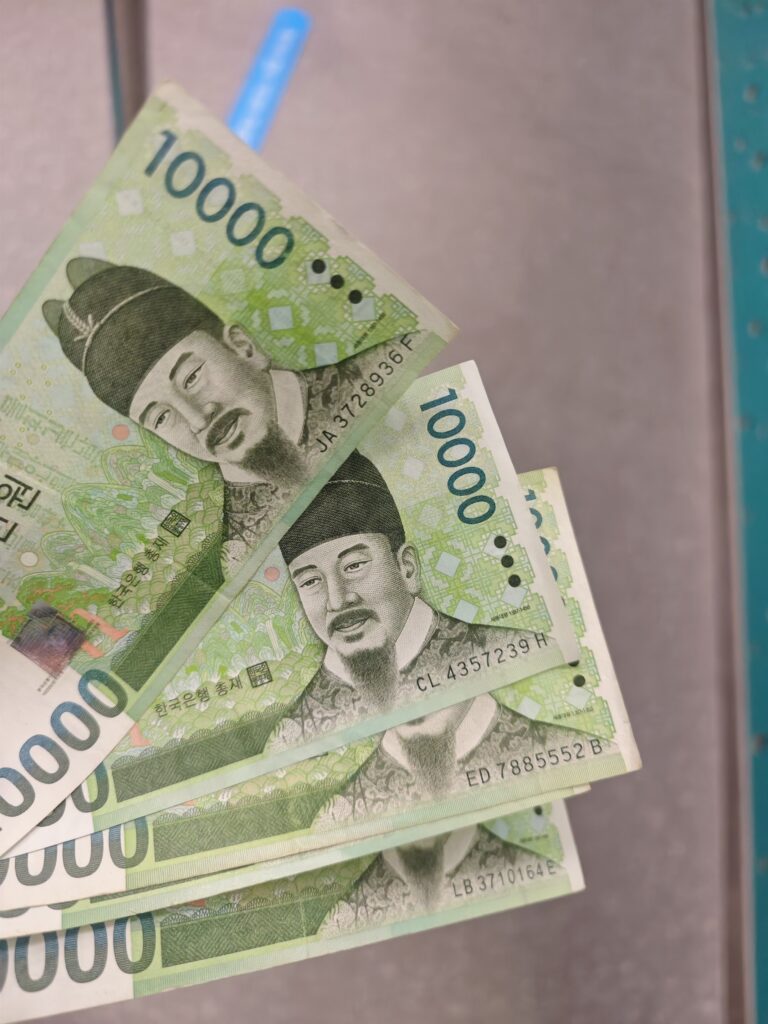 まずはATMで5万ウォン(5000円)おろします。結論から言うと、4時間の滞在でメシを食べまくっても2万2000ウォン(2200円)余りました。韓国はまた来ることがありそうですし、ウォンは価値もそこそこ安定してそうなので、まあ余ってもええか、という感じです。