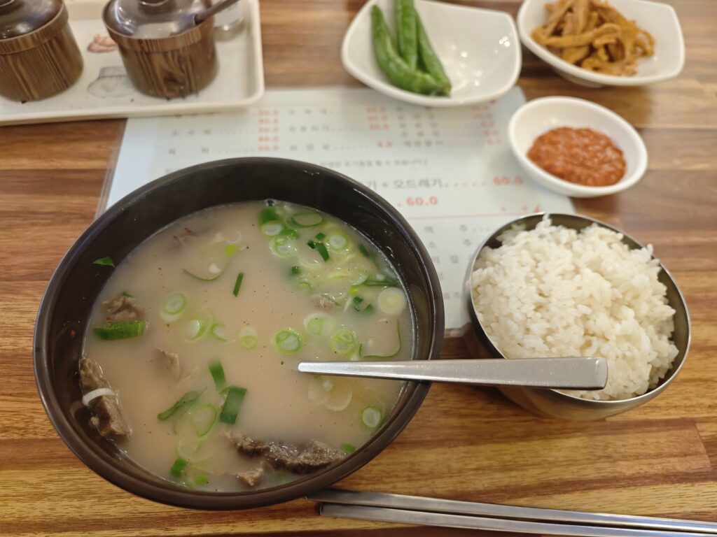 来ました。ヌードルではなくスープだったようです。調べてみると、コムタンは牛のスネなどを煮たスープのことらしいです。