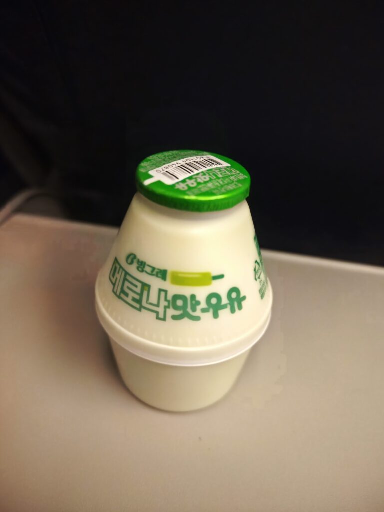 論理出国エリアでめちゃくちゃたくさん売ってたメロン牛乳と、韓国っぽいフランクフルトを買って機内での朝飯にしました。メロン牛乳はメチャクチャうまくて、そしてフランクフルトはまずかったです。温めて食うものだったのかもしれません。