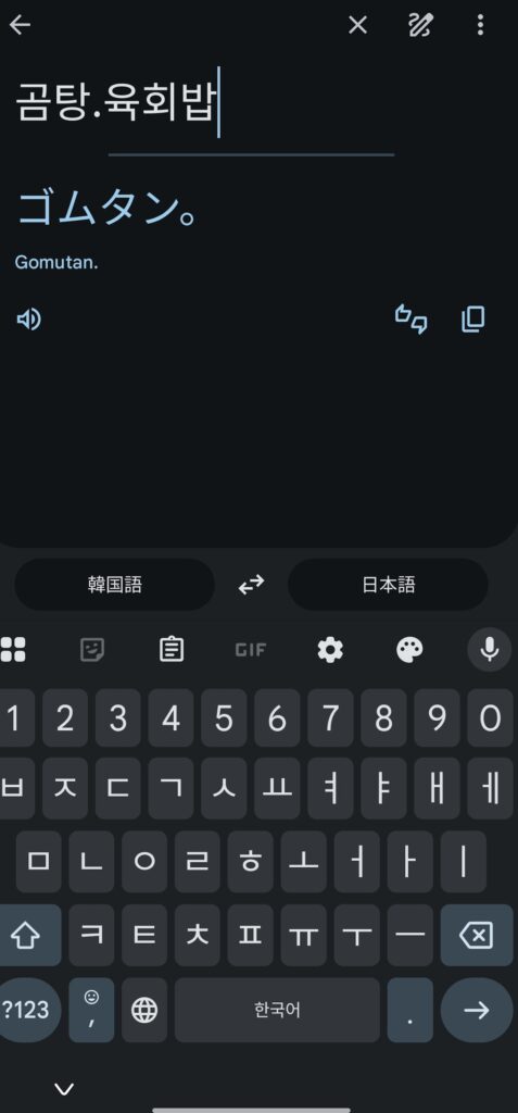 なんとかGoogle翻訳で意思疎通を図ってみます。「食事をしたいです。営業していますか?」と韓国語で見せたところ、「ゴムタン」と帰ってきました。