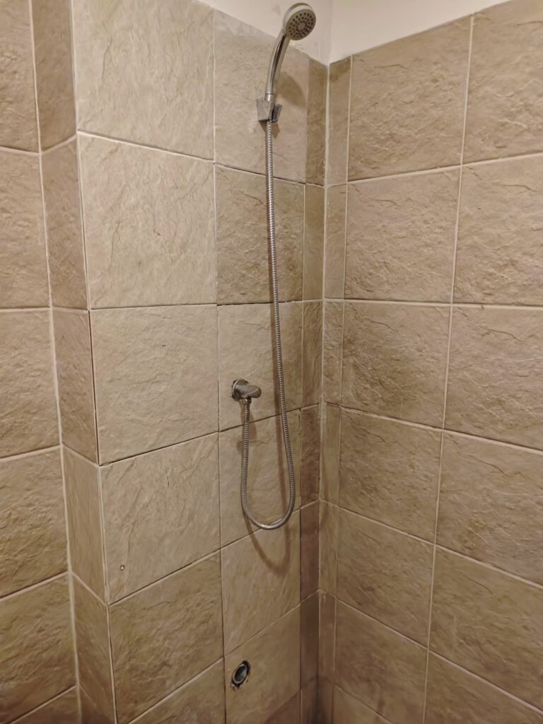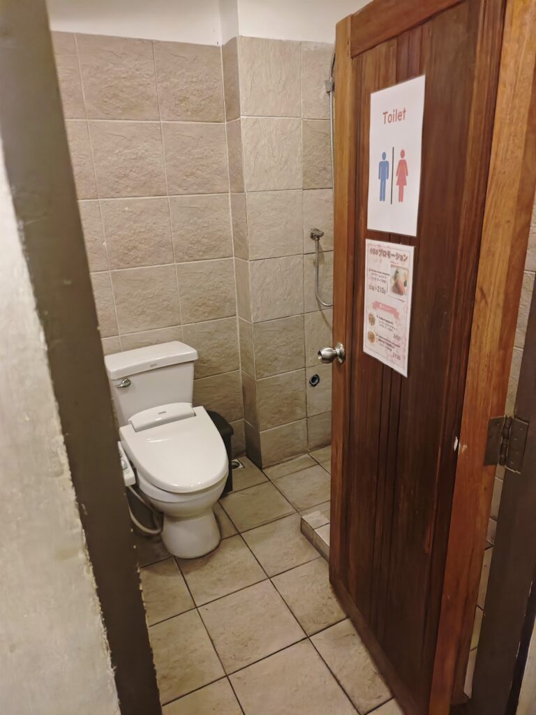 誰が使ったかわからない共用トイレと一緒になっていて、しかもお湯が出ずタオルも無くボディーソープもないので割と過酷でした。トイレのハンドソープで体を洗って持ってきたタオルで体を拭きます。