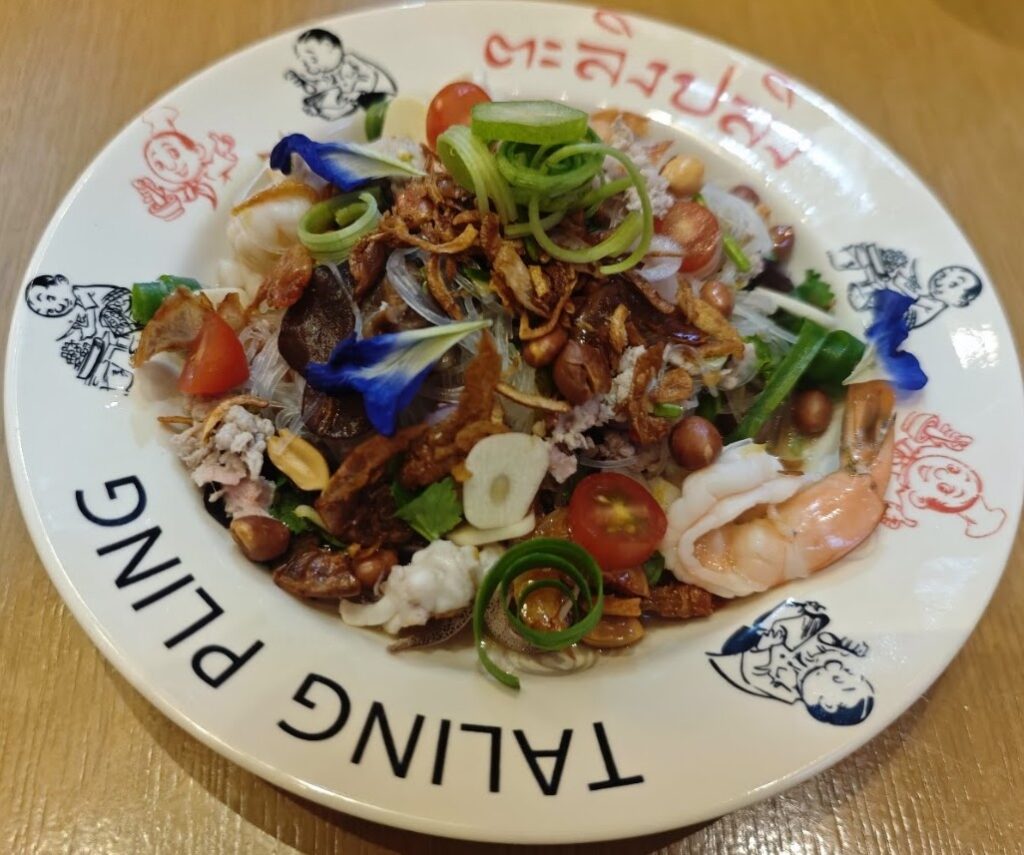 海鮮がゴロゴロ入った春雨の温サラダ「ヤムウンセン」を食べます。タイ料理の定番ですね。
