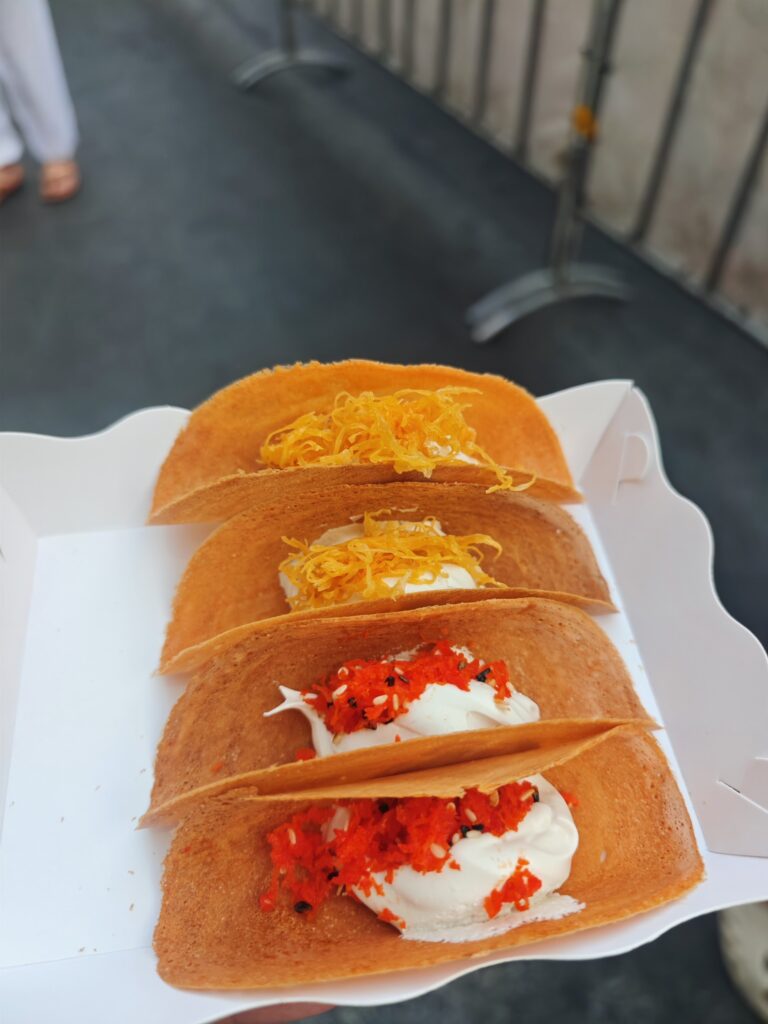 パリパリの生地にクリームが乗っていて、オレンジのほうは甘くて、赤いやつはしょっぱいエビ風味でした。超うまいです。