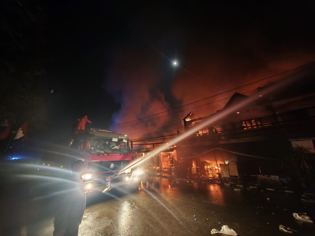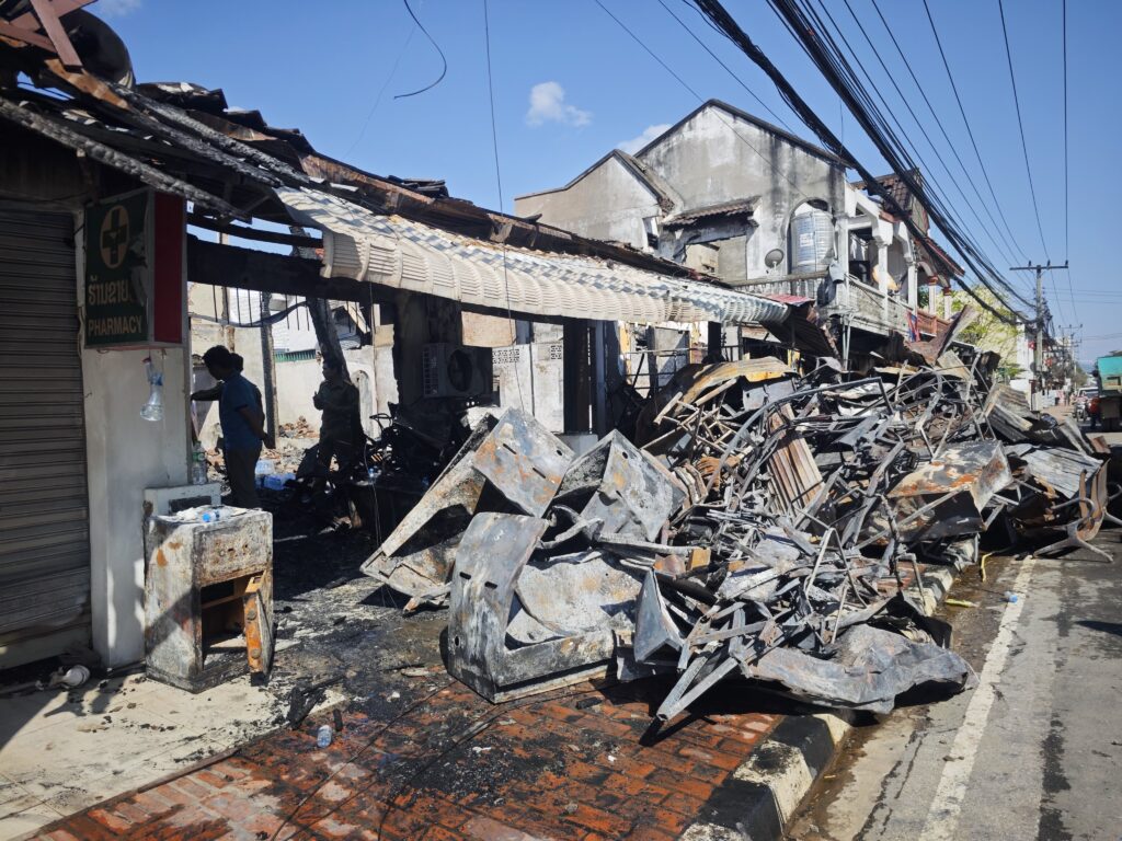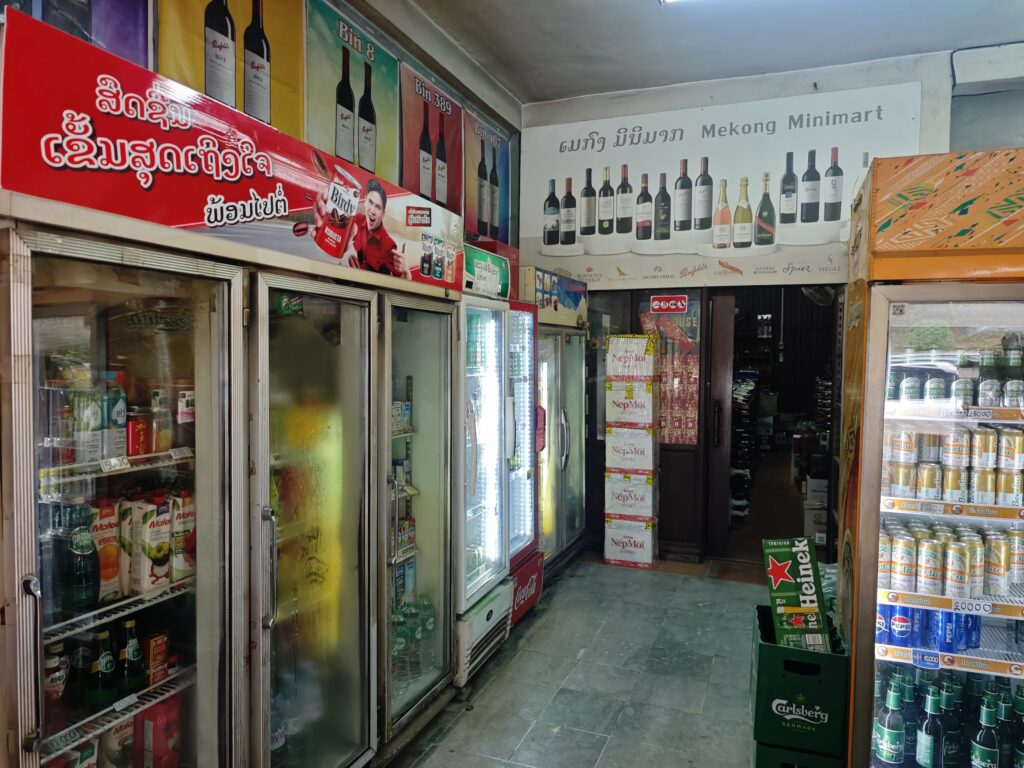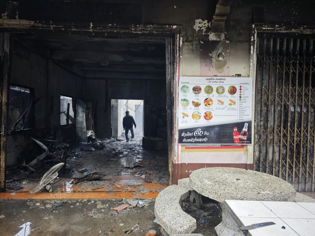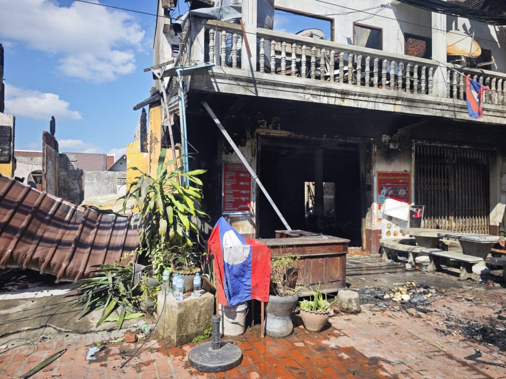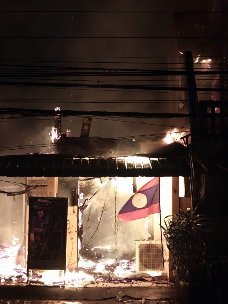 まだ燃える前にお店の人が冷蔵庫や商品を避難させたみたいで、路上に酒やジュースが広げられている。なにせラオスは平均月給が8000円とかの国だ。ルアンパバーンはインバウンドの観光業が盛んな大きな街なのでもっと稼いでいるだろうと思うが、それでも冷蔵庫や外国のお酒は危険を顧みずに運び出す程には大切な物のようだ。