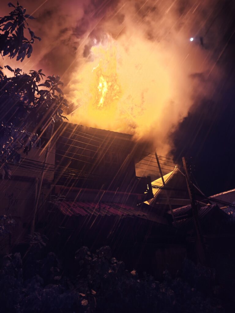 たぶんどこかでボヤでも起きてるんだろうと察して、貴重品だけ持って外に出たところ、ホテルの隣の家が思ったより激しく燃えていて驚いた。