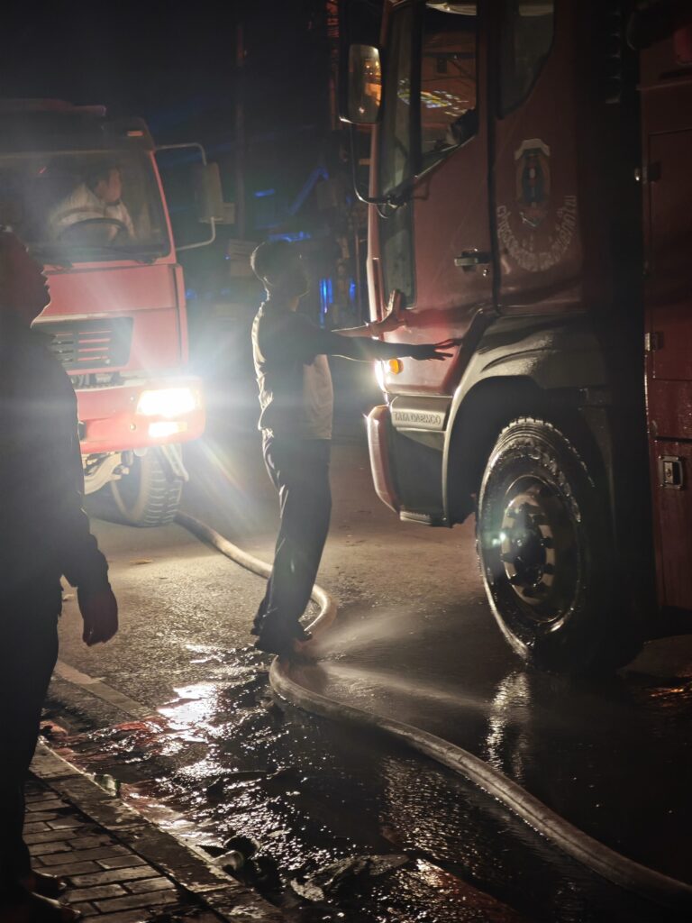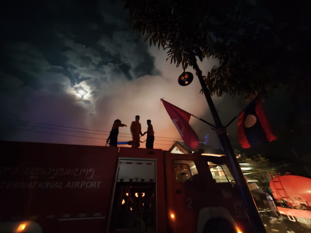 おれが泊まっていたホテルの別棟の屋根に消防士が登って消火することになった。自分にできることを考えた結果、ラオスの市民が屋根にホースを運び込むときに階段の足元をライトで照らす係をやっていた。ラオ語がわからない外国人にできることはそのくらいしか無い。それすら意味があったのかはわからないし、むしろ邪魔ですらあったかもしれない。