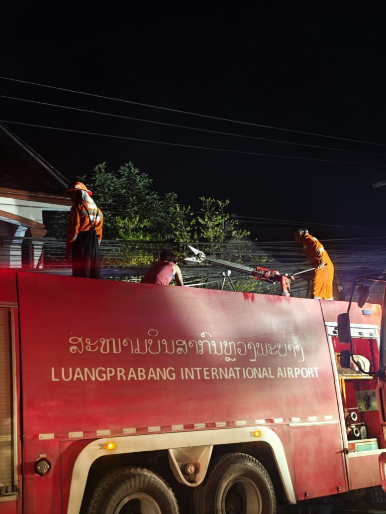消防車がもう一台やってきた。車体にLUANGPRABANG INTERNATIONAL AIRPORTと書かれている。近所の空港から駆けつけた消防車のようだ。飛行機の火災を消すためのものだろうか?