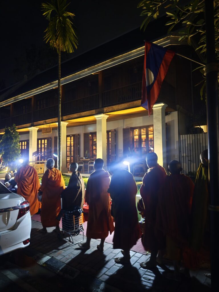 ルアンパバーンにはたくさんのお寺があって、朝になるとお坊さんが街を歩きながら人々に食料を貰って回る。これは伝統行事で、毎日行われている。観光客も托鉢用の屋台で食料を買えば椅子にしゃがんで仏僧に食料を寄付することができる。厳かな雰囲気だ。