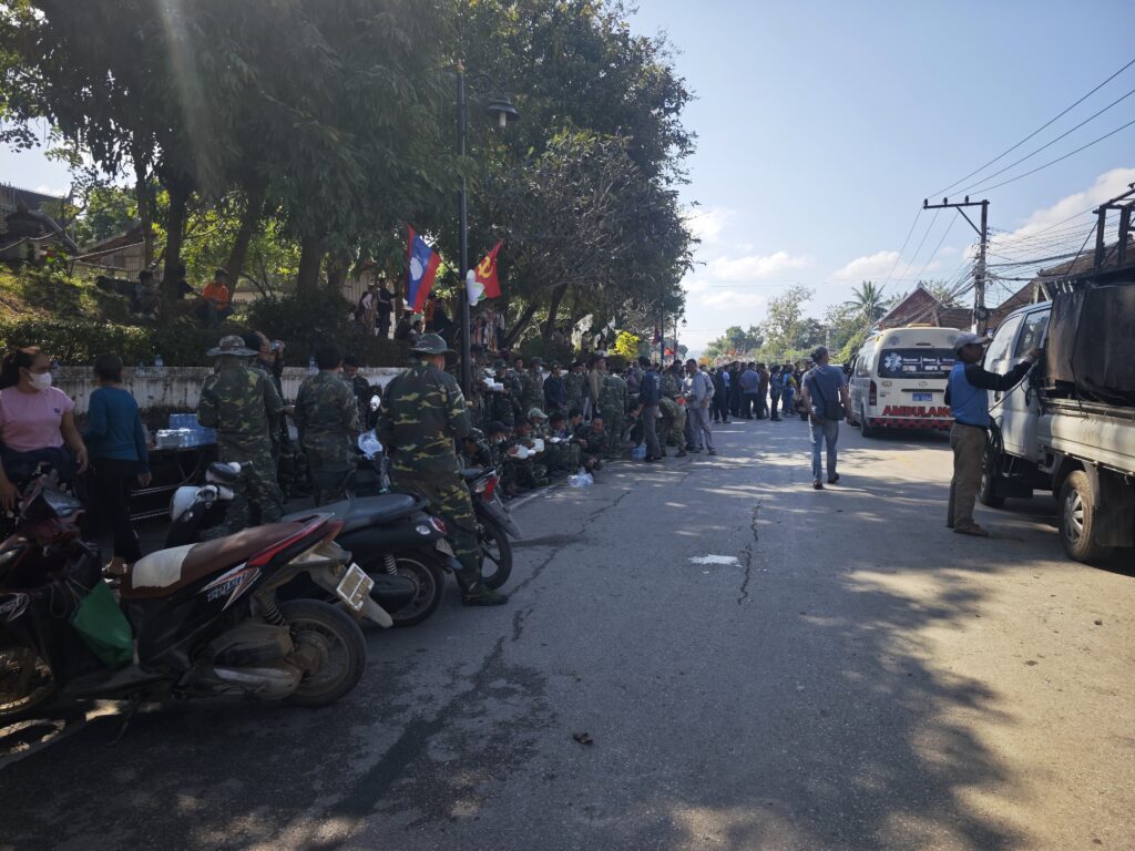 通りに出ると、ラオス軍の人たちがチャーハンの弁当を食べて休憩していた。いつのまにか出動して片付けに従事していたようだ。