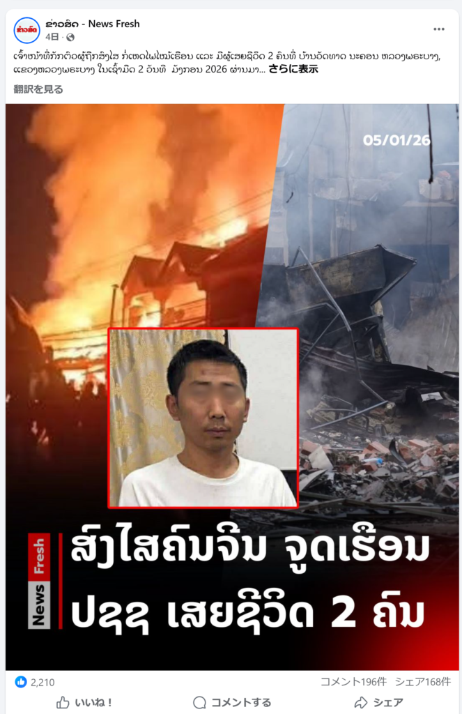 実はこのニュースを発見する数日前に、Facebookのラオ語の投稿で、現地ニュースメディアのアカウントが「火事は中国人による放火で、逃亡していた中国人は中国との国境に入る直前で逮捕された。当局から数日中に発表があるだろう」などと書いてあるのを、おれは見つけていた。