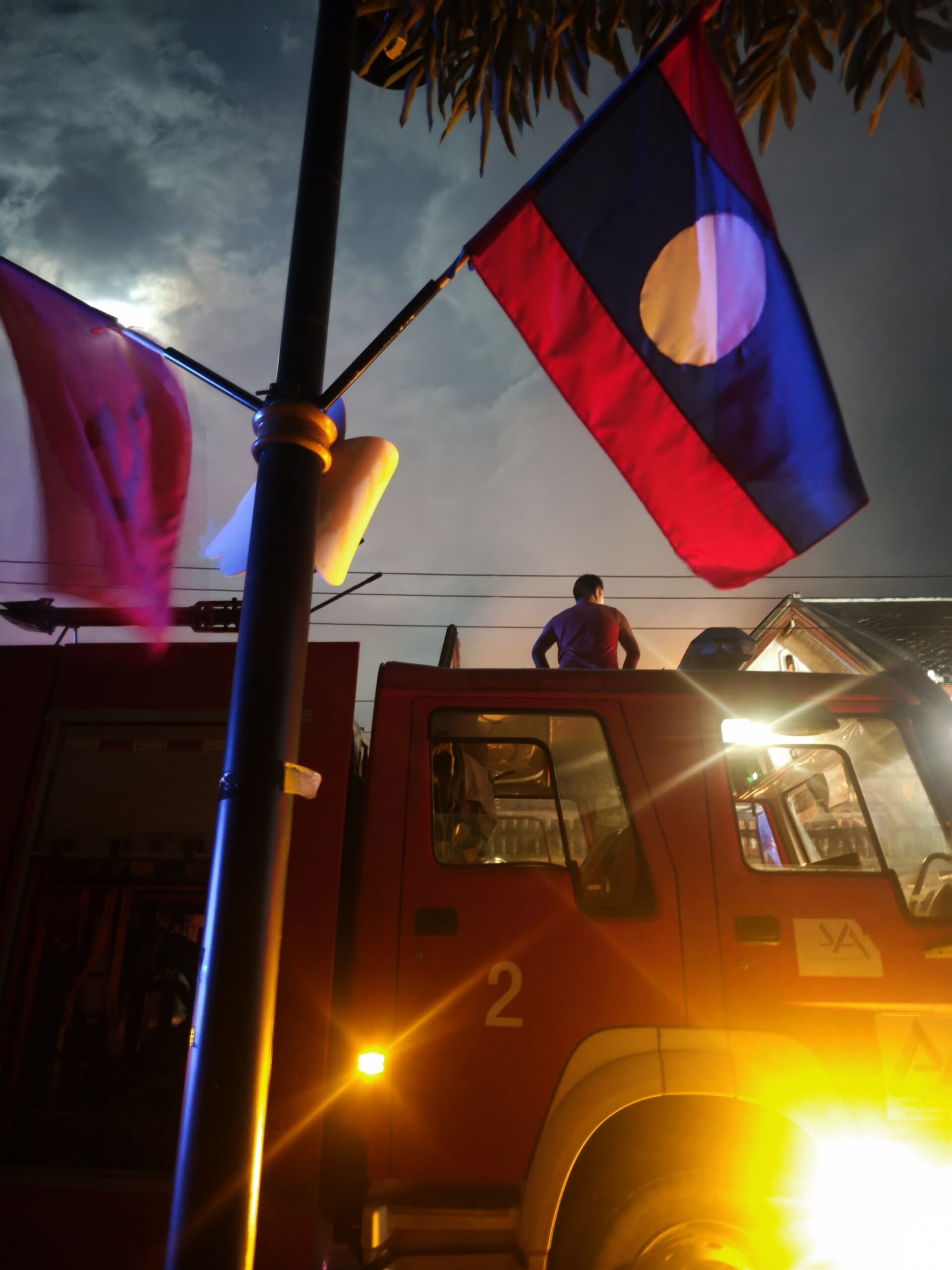 おれが泊まっていたホテルの別棟の屋根に消防士が登って消火することになった。自分にできることを考えた結果、ラオスの市民が屋根にホースを運び込むときに階段の足元をライトで照らす係をやっていた。ラオ語がわからない外国人にできることはそのくらいしか無い。それすら意味があったのかはわからないし、むしろ邪魔ですらあったかもしれない。